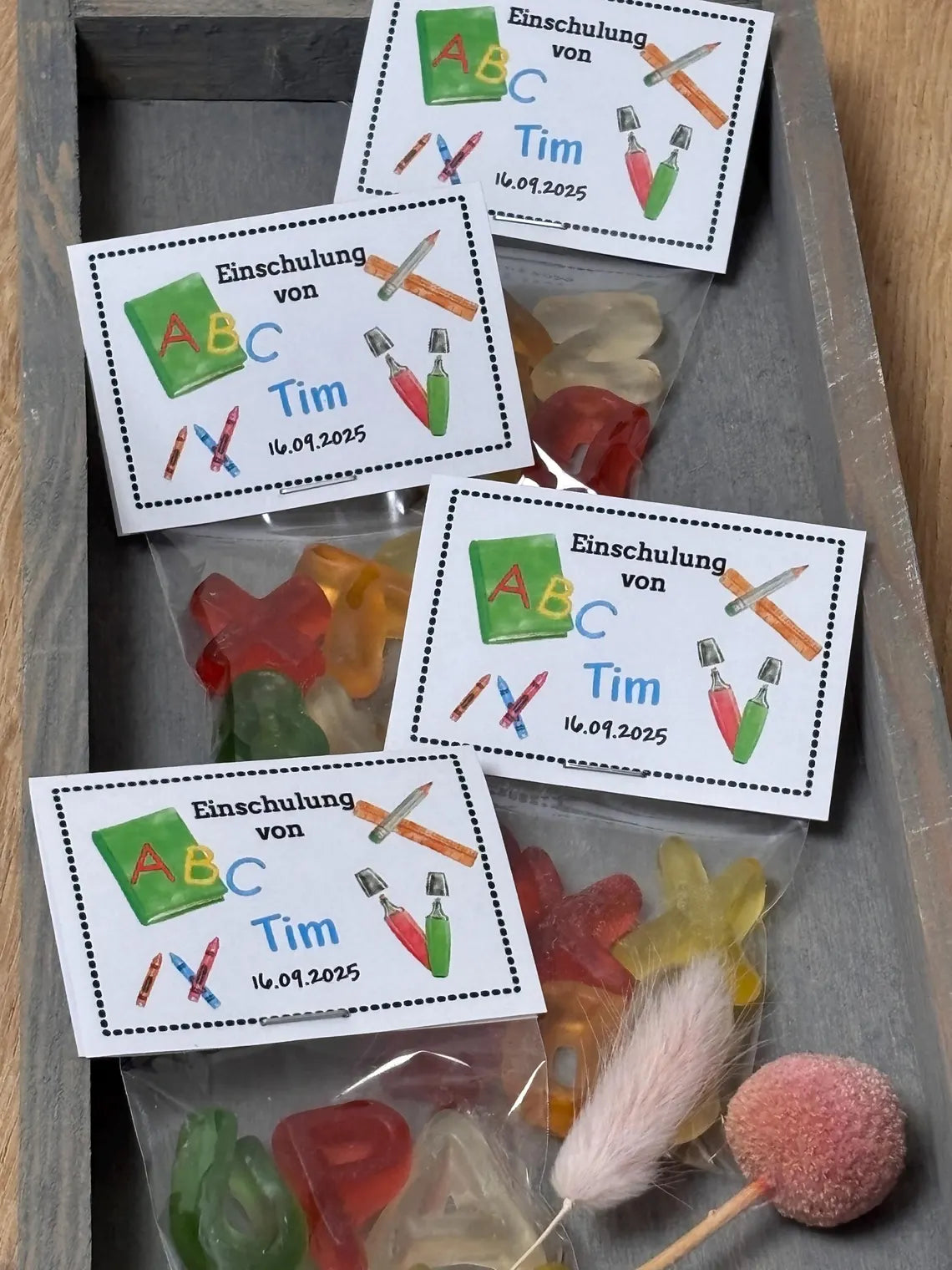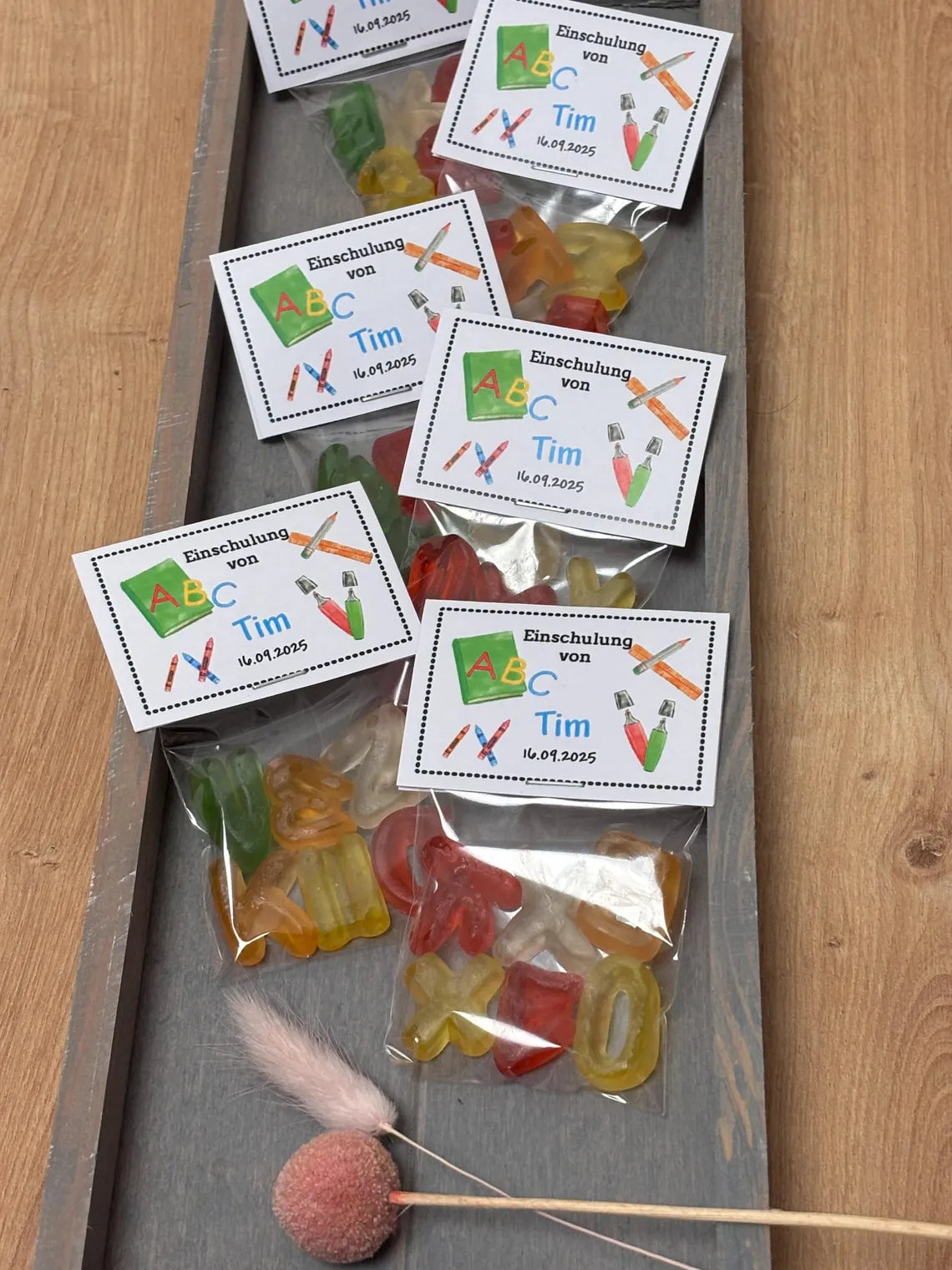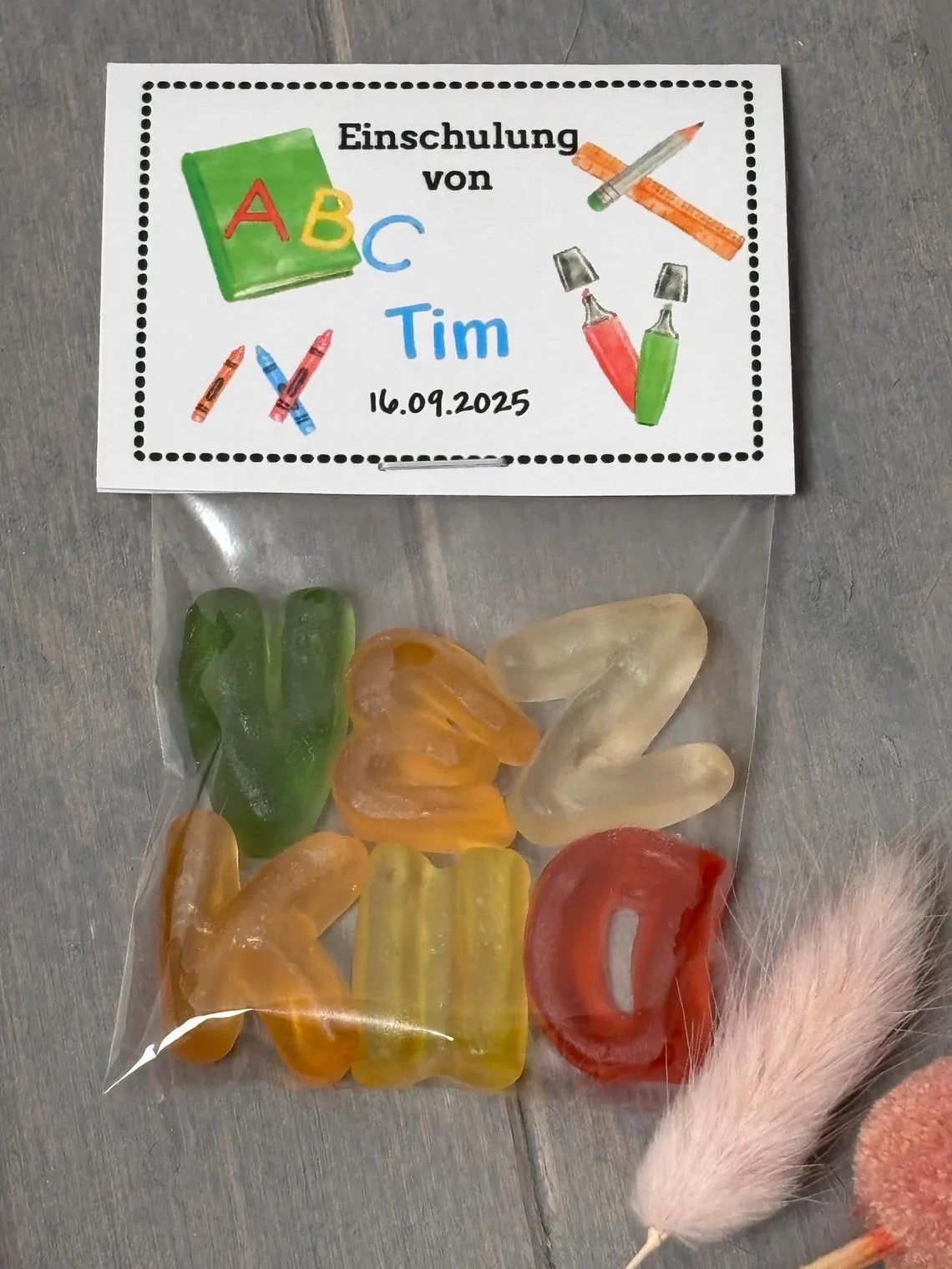 Der erste Schultag wird bunt & lecker! Mit unseren ABC-Gummibärchen-Tütchen habt ihr die perfekte Kleinigkeit für eure Gäste zur Einschulung. Die süßen Buchstaben-Snacks sorgen für strahlende Kinderaugen und sind ein liebevolles Andenken an diesen besonderen Tag. 💌