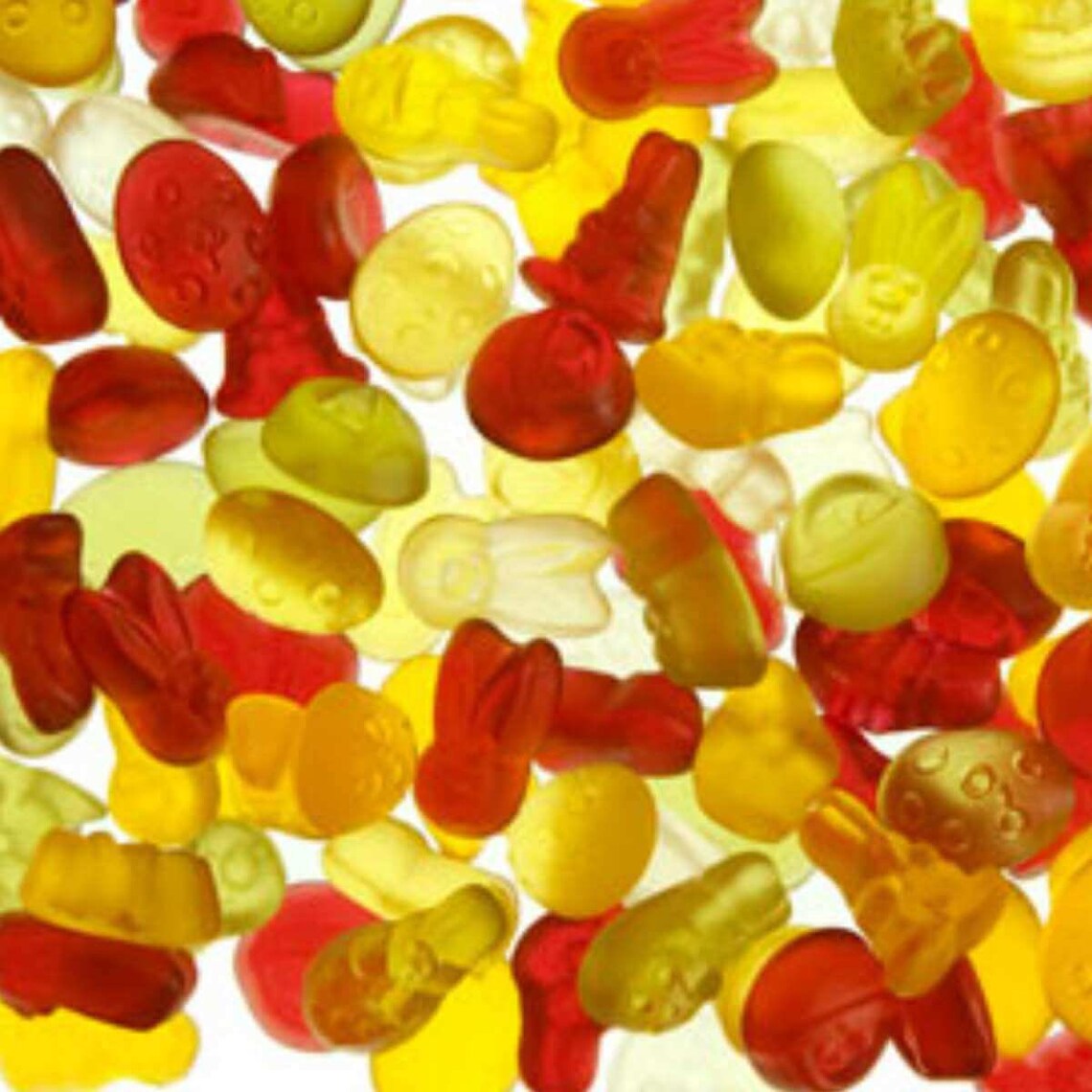 Fruchtgummi mit 10% Fruchtgehalt aus Fruchtsaftkonzentrat mit Orangen-, Passionsfrucht-, Erdbeer-, Apfel-, Pfirsich- und Cassisgeschmack
