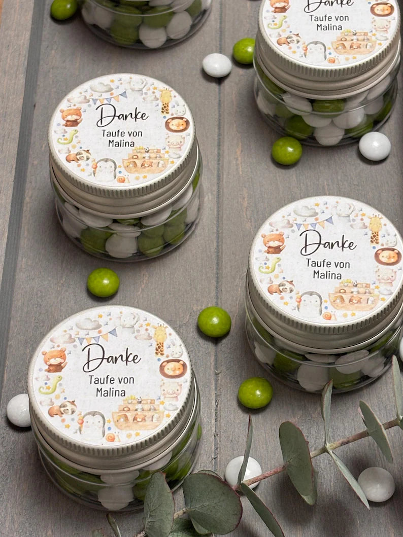 Verleiht eurem Fest – sei es zur Taufe, Kommunion oder Konfirmation – mit diesen süßen Mini-Döschen das gewisse Etwas. 🌸 Jedes Döschen trägt ein liebevolles „Danke mit Tierkranz“-Etikett, das den natürlichen Charme von Tieren und Flora vereint. 🌻 Gefüllt mit bunten Schokolinsen 🍬 ist es das perfekte, personalisierte Gastgeschenk für eure Gäste! 🎁
