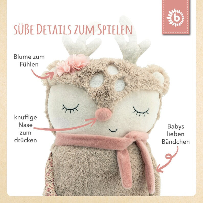 Ein Freund für alle Fälle: Das niedliche Reh Ella mit dem verträumten Blick wird Deinem Baby ein treuer Begleiter in allen Momenten sein. Durch die unterschiedlichen Stoff- Strukturen bietet das Plüschtier viele Greif- und Tatst-Möglichkeiten. Das Kuscheltier ist samtig weich und wird Dein Baby tagsüber bei Abenteuern sowie nachts im Land der Träume begleiten, Freude und Wärme schenken. Auf dem großen und flachen Bauch liegt das Köpfchen von deinem Kind wie auf einem Schmusekissen. Mit einer Größe von 55 cm, hat das flauschige Reh die perfekte Größe zum Drücken und Schmusen für Dein Baby.