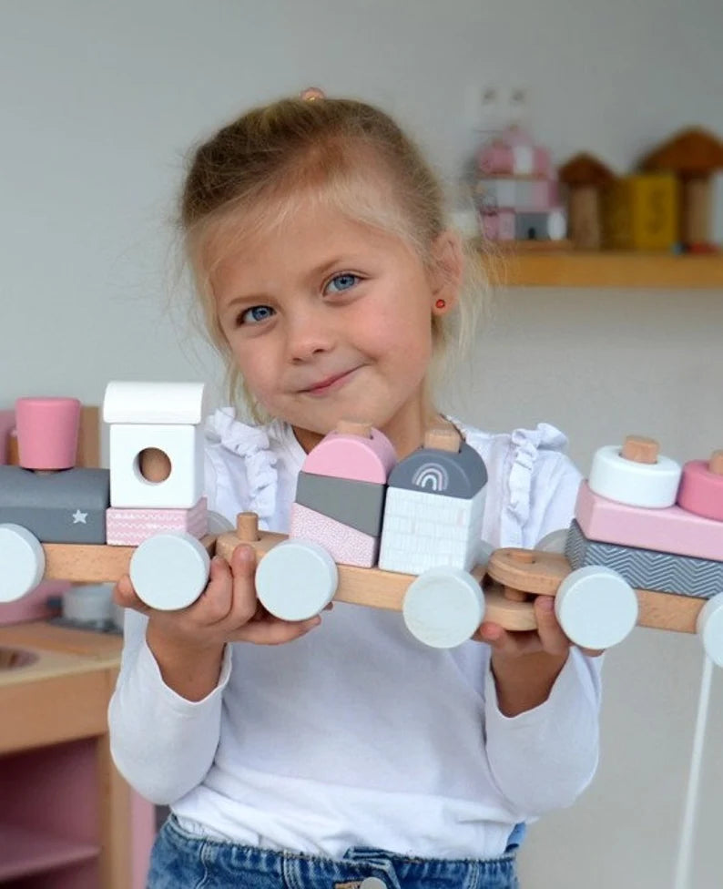 Der Label Label Stapelzug ist aus hochwertigem FSC-zertifiziertem Buchenholz gefertigt und wurde mit kindgerechter Farbe auf Wasserbasis mit wunderschönen sanften Rosa-, Weiß- und Grautönen verziert.