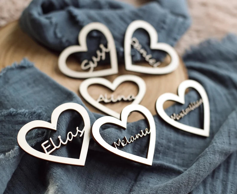Personalisierte Platzkarten im Herz – Liebevolle Namensdeko aus Holz 💒💗