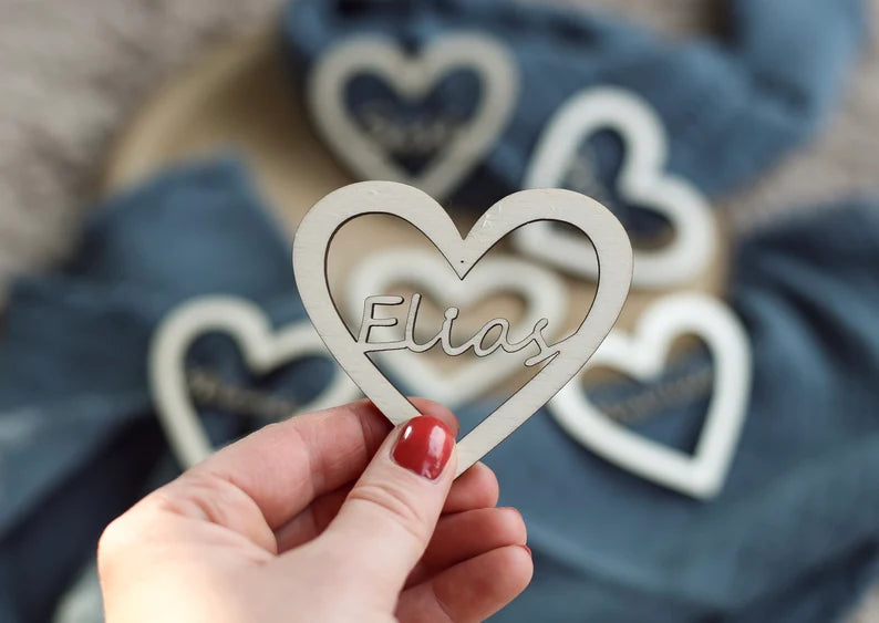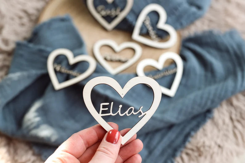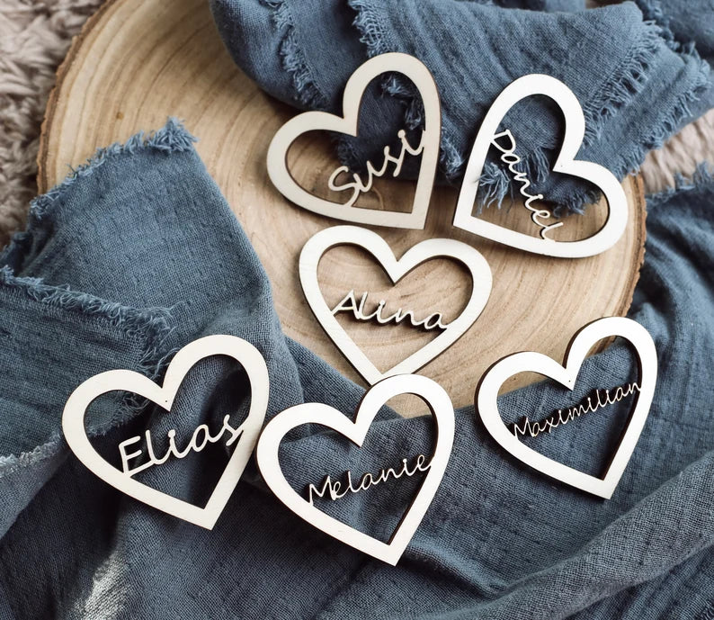 Diese Herz-Namensschilder aus Holz sind das kleine Detail mit großer Wirkung! Perfekt als Platzkarte zur Hochzeit, für Taufen, Feste oder andere besondere Anlässe – und gleichzeitig ein persönliches Gastgeschenk zum Mitnehmen.