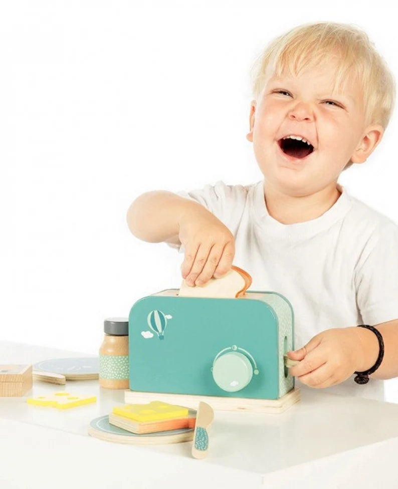 Der Toaster hat ein Zifferblatt, um die Zeit zu simulieren, und wenn Ihr Kind den Hebel drückt, springen die Sandwiches im Handumdrehen heraus! Mit diesem Toaster wird Ihr Kleines zum wahren Küchenprinzen. Hergestellt aus FSC-Holz. Geeignet für Kinder ab 3 Jahren.