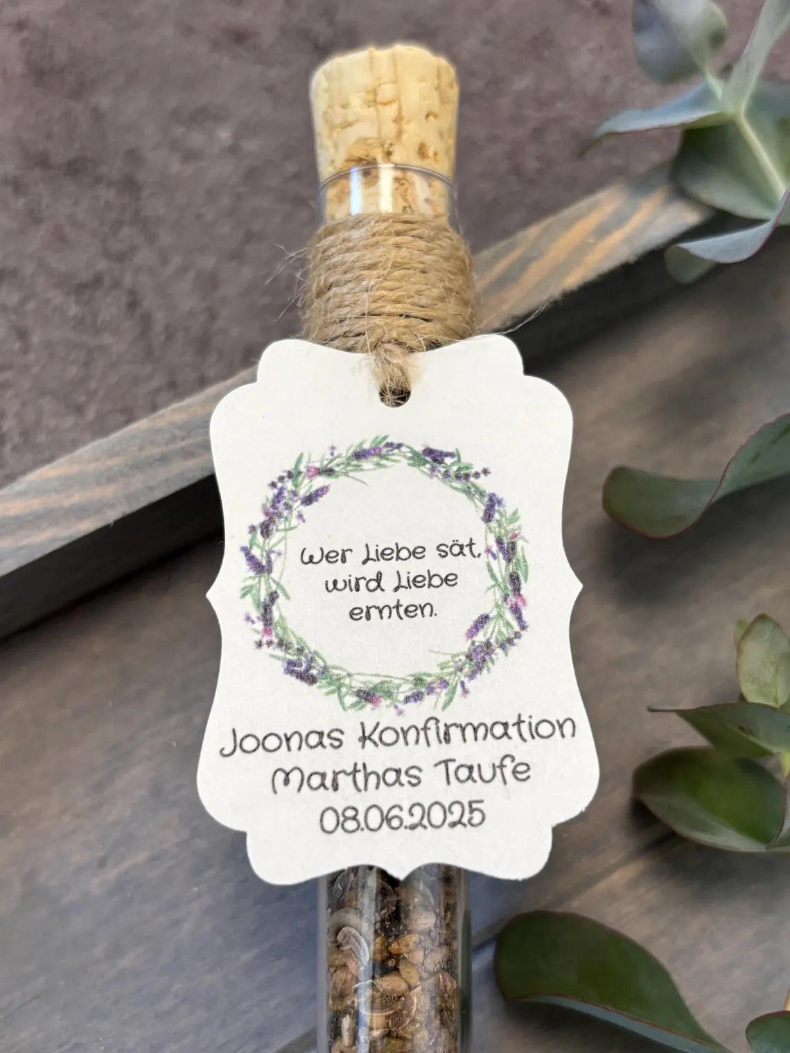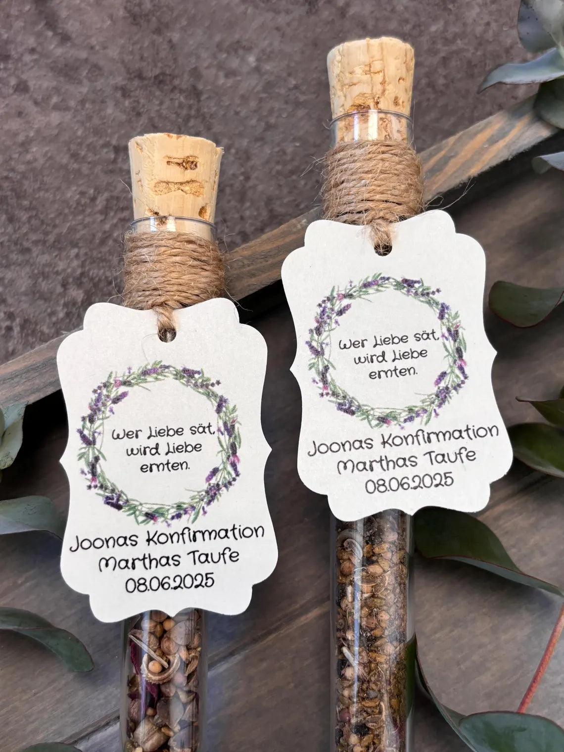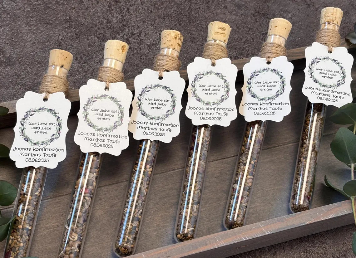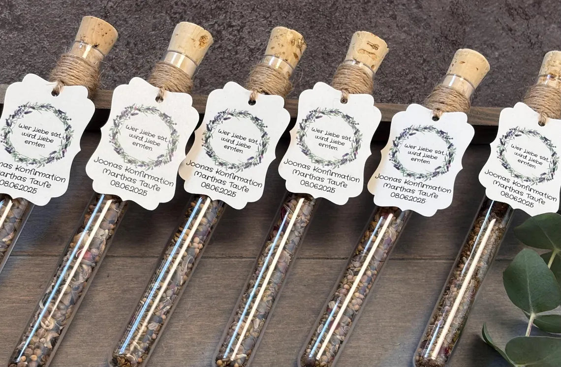 Jedes Reagenzglas (160 x 16 mm) wird mit viel Sorgfalt befüllt und kann personalisiert werden, mit Namen, Festart und Datum. So entsteht ein individuelles, nachhaltiges Andenken, das bei deinen Gästen garantiert in guter Erinnerung bleibt. 🌿